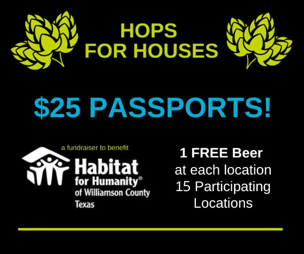 The Hops for Houses Passports: Enjoy a complimentary beer when you visit each of the 15 participating Central Texas breweries, plus the opportunity to be entered into our raffle drawing if you visit ALL 15 locations. Proceeds directly support Habitat for Humanity of Williamson County and its mission to provide affordable housing to individuals and families in need in Williamson County.