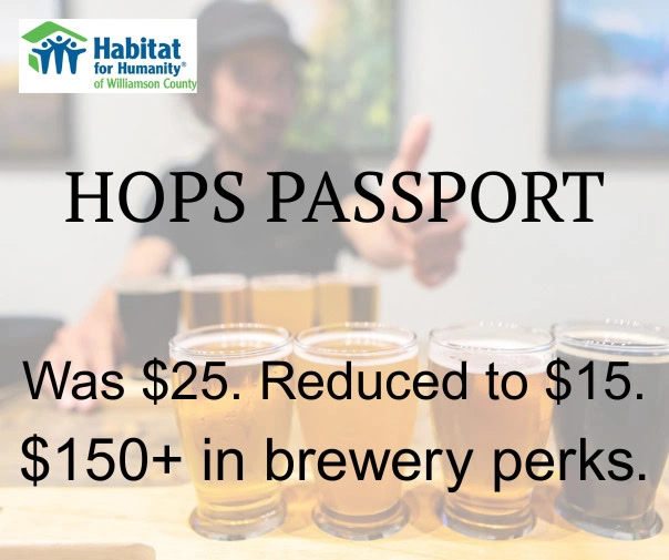 Enjoy a complimentary beer when you visit each of the 15 participating Central Texas breweries, plus the opportunity to be entered into our raffle drawing if you visit ALL 15 locations. Proceeds directly support Habitat for Humanity of Williamson County and its mission to provide affordable housing to individuals and families in need in Wilco.